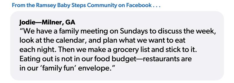 Our friend Jodie from the Ramsey Baby Steps Community Facebook group put it this way: “We have a family meeting on Sundays to discuss the week, look at the calendar, and plan what we want to eat each night. Then we make a grocery list and stick to it. Eating out is not in our food budget—restaurants are in our ‘family fun’ envelope.”